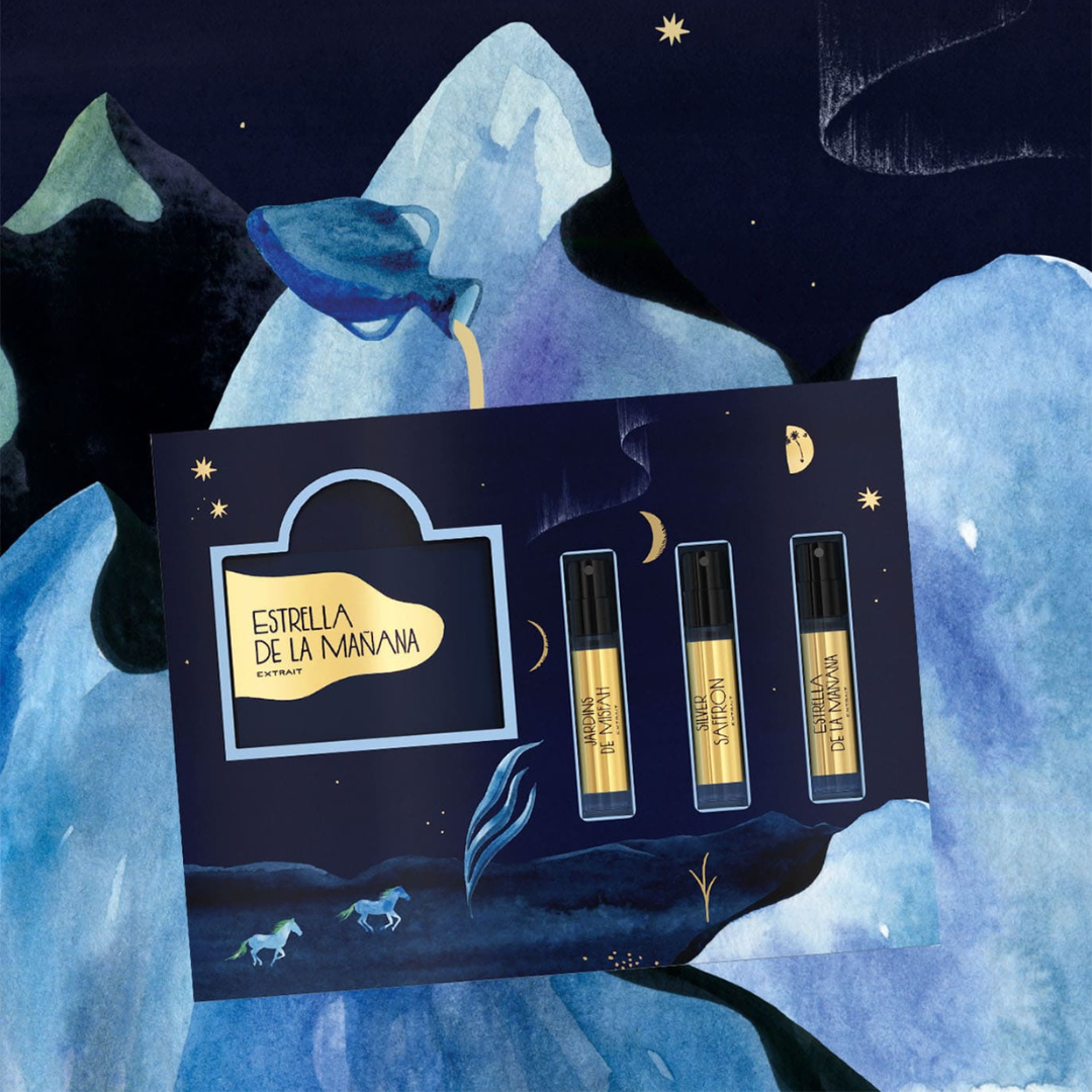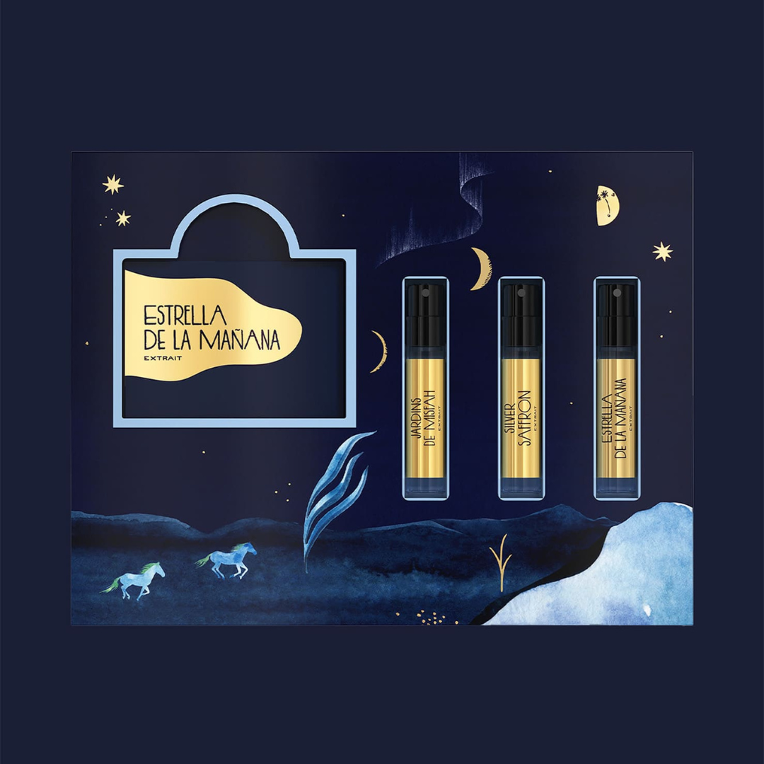 Each essence contained in the Discovery Kit is part of a collection known as 'Extraits de Voyage', which intertwines real and imagined stories, passed down from generation to generation. By applying these fragrances, you will be transported to storybook landscapes, new heroes, and destinations, just like the gentle murmur that the night wind brings.